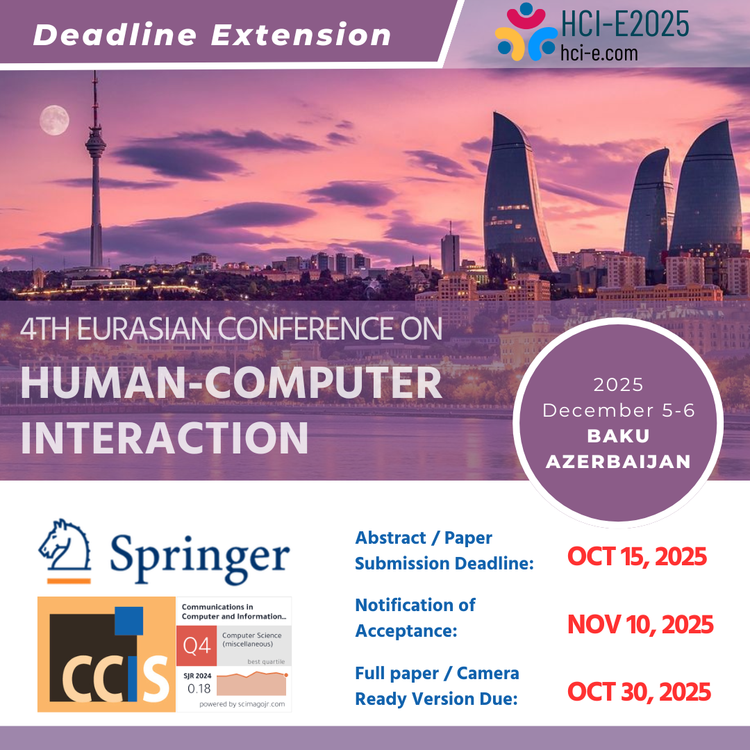 The HCI-E 2025 is co-organized by Azerbaijan State University of Economics (UNEC), Institute of Control Systems, TED University, Bahçeşehir University, and Atatürk University. Submitted papers are expected to cover research studies on challenging and innovative topics, theories, development, and implementation in Human-Computer Interaction. Some of the examples are novel theoretical/practical approaches to interaction, innovative user interface concepts, new interaction devices, UX methods, multimodal user interfaces, BCI, accessibility, SW methodologies, emotions in HCI, aesthetic issues, HCI and children, evaluation methods and tools, and many others. Briefly, participation is encouraged in the HCI-E 2025 for scientific research and innovation in Human-Computer Interaction.